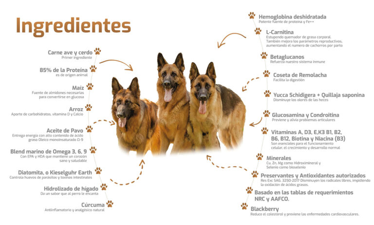 Carne de ave y cerdo, Maíz de grano molido,Arroz de grano, Aceite de pavo, Coseta de remolacha,Blend de aceite omega 3, 6 y 9, Hidrolizado de hígado, L-Carnitina, Betaglucanos, Diatomita, Levadura de cerveza, Fibra dietética, Yucca schidigera, Condroitina , Glucosamina, Vitaminas y Minerales de acuerdo con las tablas de requerimientos NRC y AAFCO de Norteamérica.